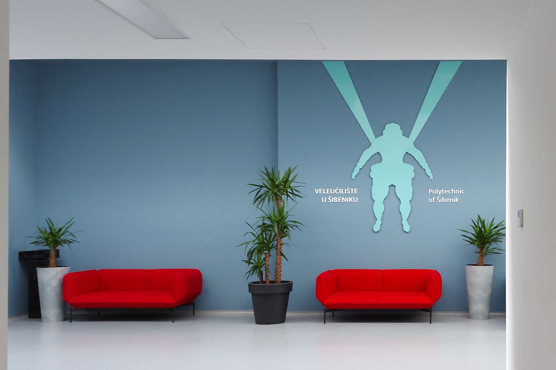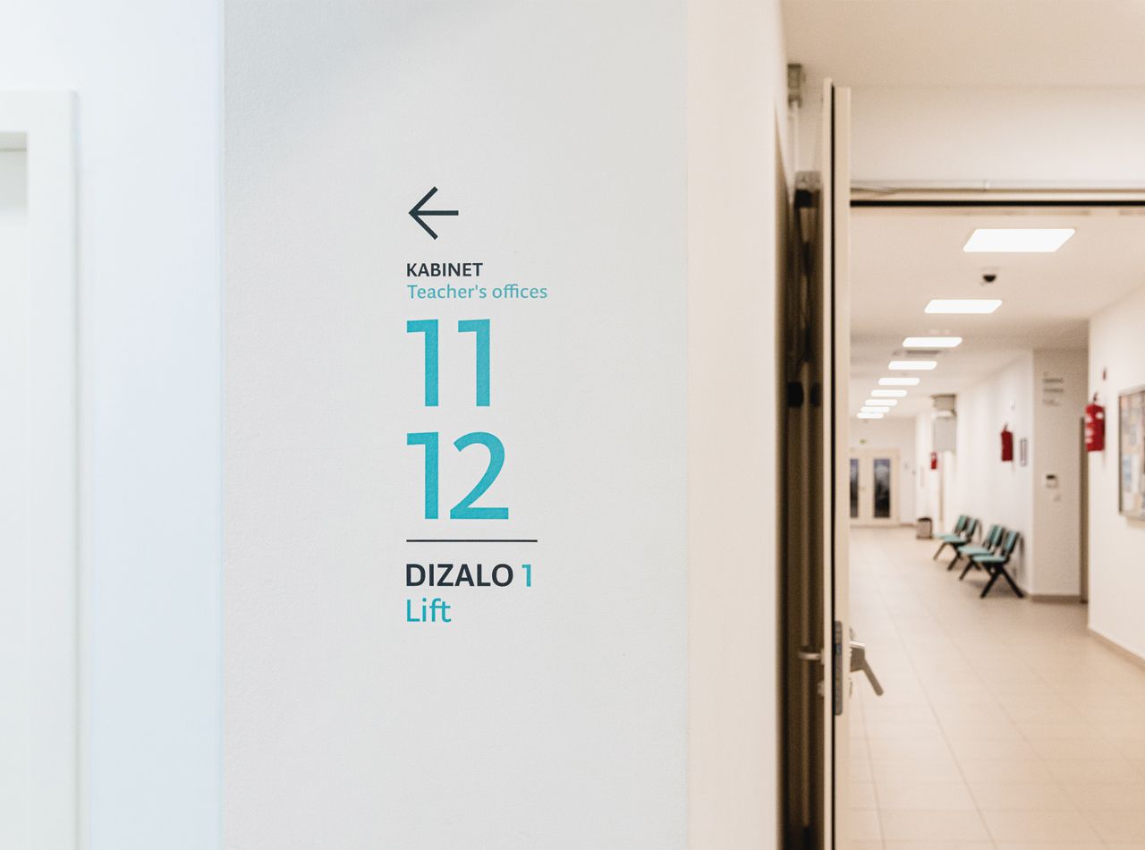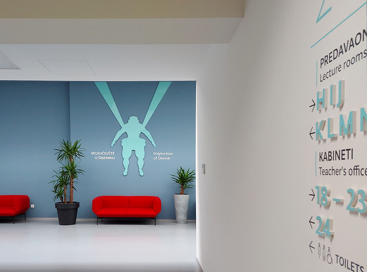 Sustav unutarnje signalizacije oblikovan je za jasno i intuitivno snalaženje u prostoru Veleučilišta u Šibeniku. Temelji se na jednostavnoj tipografskoj hijerarhiji i modularnom sustavu oznaka koji se prilagođava različitim dijelovima zgrade.